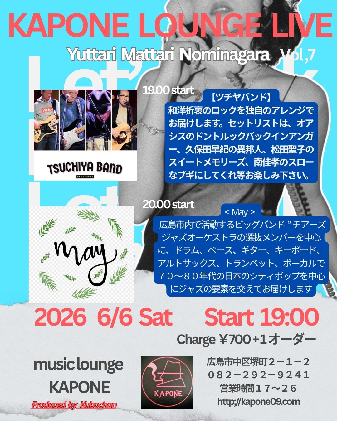 « イベント一覧 KAPONE LOUNGE LIVE Yuttari Mattari Nominagara vol.7 6月 6日 @ 7:00 PM - 9:30 PM « KAPONE LOUNGE LIVE Yuttari Mattari Nominagar Vol,6 出演 ①TSUCHIYA BAND…19:00から ②May…20:00から チャージ¥700+1ドリンクオーダー カレンダーに追加 Google カレンダー iCalendar Outlook 365 Outlook Live 詳細 日付: 6月 6日 時間: 7:00 PM - 9:30 PM 会場 MUSIC LOUNGE KAPONE 堺町2-1-2 B1F 広島市中区, 広島県 730-0853 日本 + Google マップ 電話: 082-292-9241